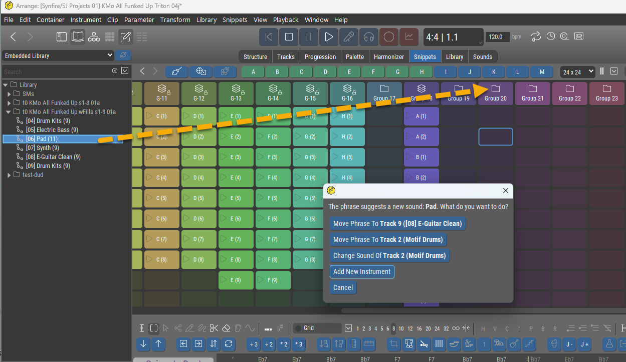 - Add New Instrument: Create a new instrument with a copy of the sound used in the library and move the phrase there.