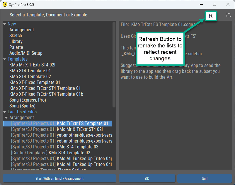 It would be helpful if the initial screen were provided with a refresh button so that the entity lists could be brought up-to-date as the user saves new files to disk without requiring a complete exit, restart, and rescan cycle.