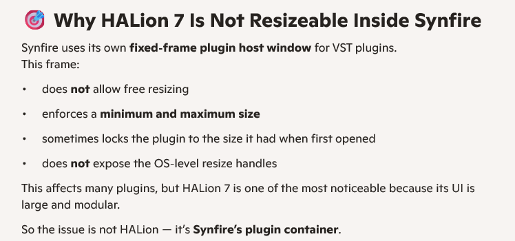 sj1 Posted Tue, 2026-01-13 - 15:09 Hi. I'm observing that I can't drag edges or corners to resize the HALion 7 window inside of Synfire. AI says this about it: Is this accurate, or misinformation? Log in or register to post comments